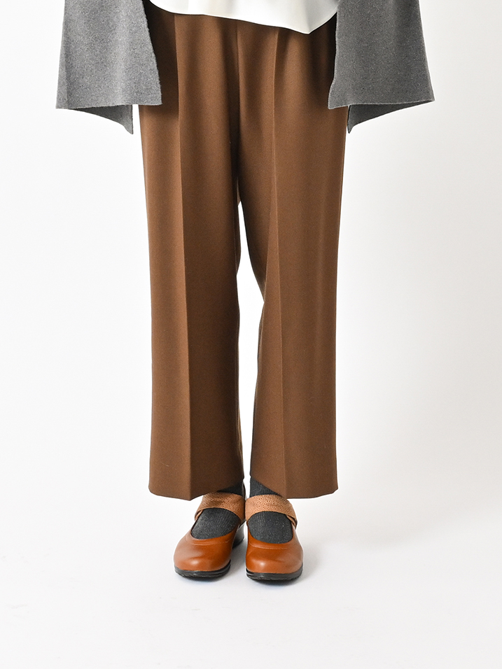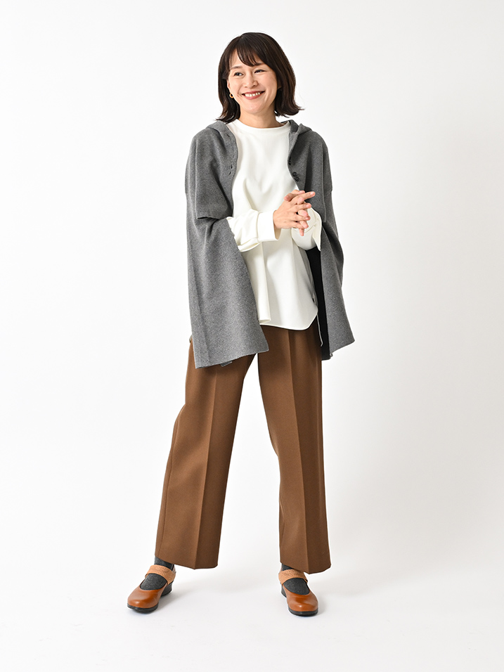 寒い季節には、同系色のブラウンのボトムスと合わせるのもおすすめです。温かみのあるコーディネートになります。