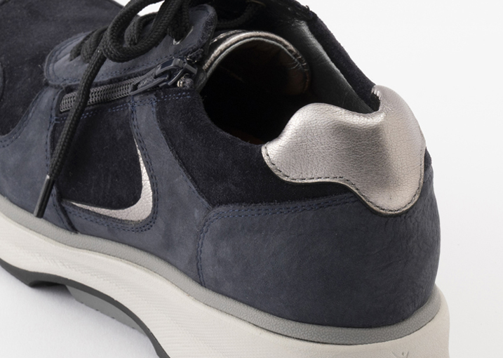 アッパーには、深みのあるスエード素材と光沢を抑えたメタリックな質感を絶妙にミックス。同系色でありながら、異なる素材が奥行きを生み出し、カジュアルながらも洗練された大人の表情を醸し出します。