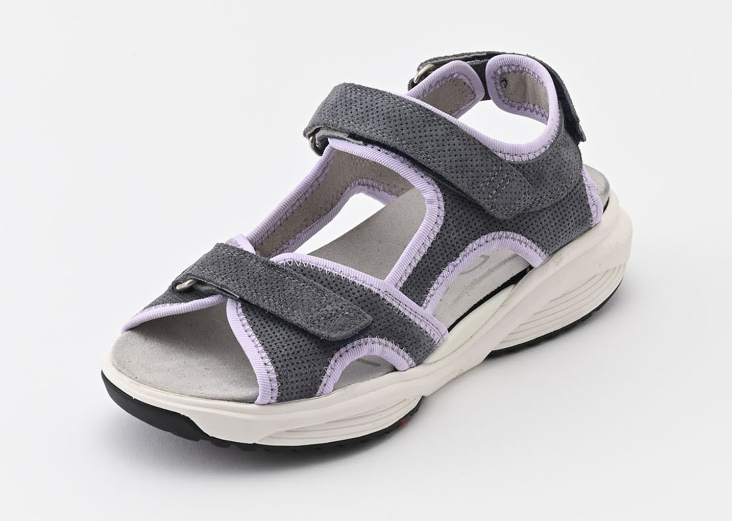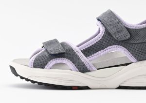 落ち着いたチャコールグレーをベースに、優しげなラベンダーカラーを差し色にした、まさに「大人の女性のためのスポーティーサンダル」。