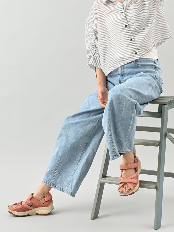 メンズライクになりがちなデニムスタイルに、このサンダルを一点投入するだけで、一気に女性らしい柔らかさと清潔感が加わります。リネンジャケットを羽織れば、都会的な大人の街歩きコーデもフィットします。