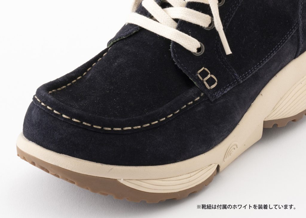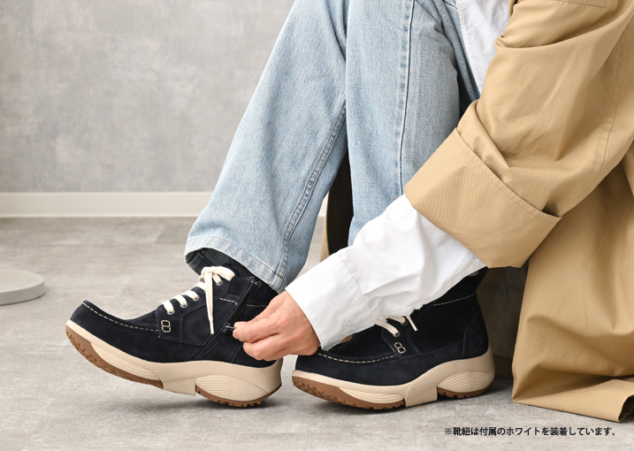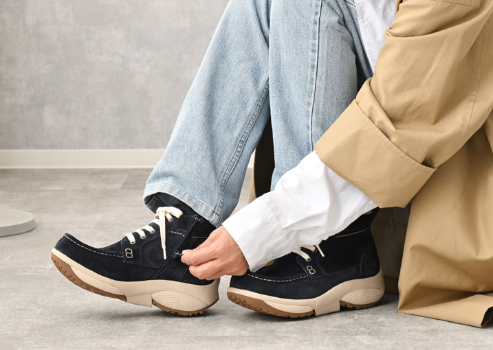 足を柔らかく包み込み足馴染の良いスエードレザーを使用。また深みのある「ネイビー」が上品で洗練された印象を与えてくれます。