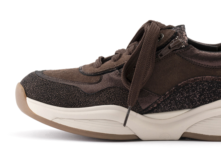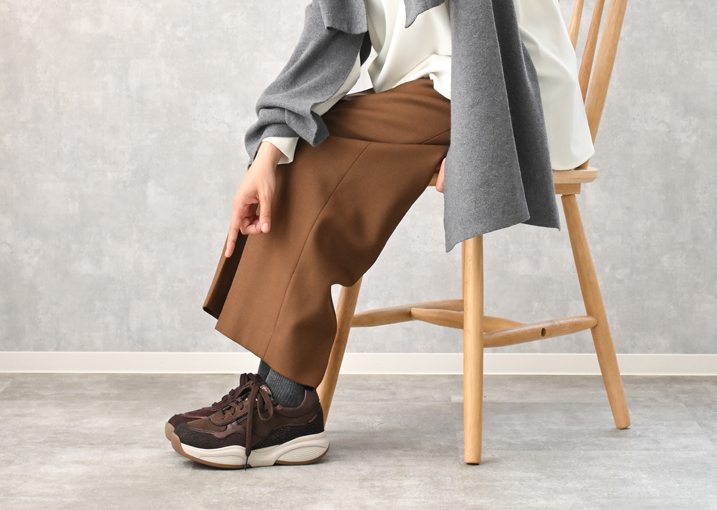 美しい光沢のあるレザーと落ち着いたダークブラウンの組み合わせは、ただのスニーカーでは終わらないエレガントさが魅力。デニムはもちろん、ワイドパンツやロングスカートなど、様々なコーディネートに合わせやすく、カジュアルなスタイルにもきれいめなスタイルにも馴染みます。