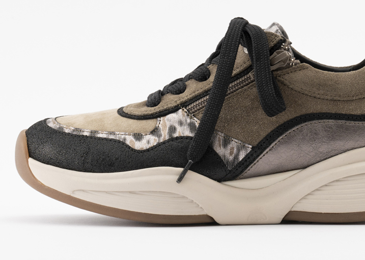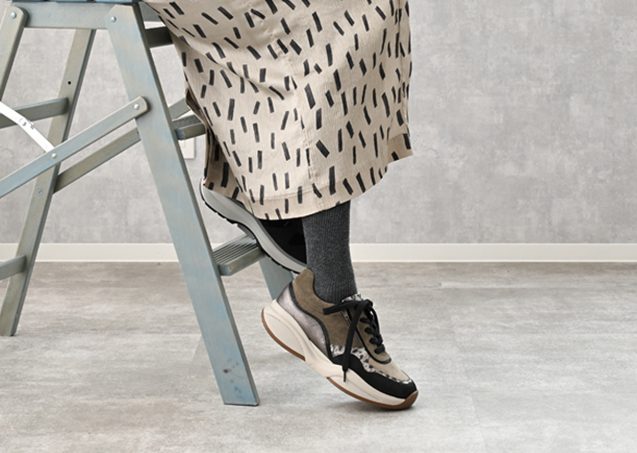 ディティールはヌバック調、メタリック、そしてレオパード柄という異なる素材を巧みに組み合わせた一癖あるレザーのコンビネーション。異なる素材でもトーンをまとめることで、個性的でありながらも、日常づかいしやすさも兼ね備えた一足に仕上がっています。レザーの質感もしっとりと心地よく、クオリティの良い素材ならではの存在感のある佇まいを感じて頂けます。