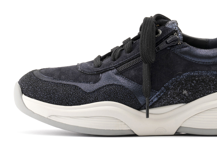 柔らかなスエードを土台に、表情豊かなレザーを巧みに配置。複数の素材が放つ光沢が、スポーティなシルエットにリュクスな雰囲気を添え、足元をエレガントに彩ります。また、ネイビーのアッパーに明るいグレーのソールを合わせることで、シーズンレスな一足に仕上げました。明るい色の服装が多い春夏には全体を引き締めるアクセントに、暗い色が多い秋冬には重くなりすぎない差し色として活躍します。