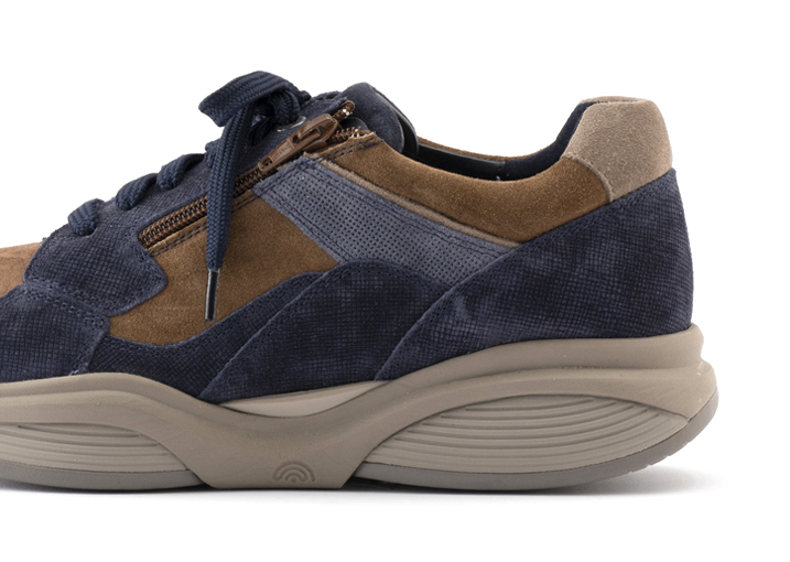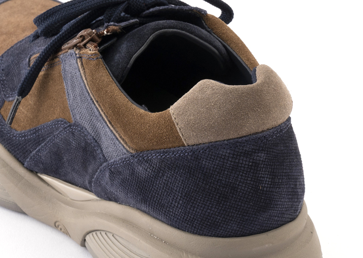 一見シンプルながら、見る角度によって表情を変えるネイビーとブラウンのコンビネーションは、大人の落ち着きと洗練を足元に与えます。単なるカジュアルスニーカーとは一線を画す一足です。