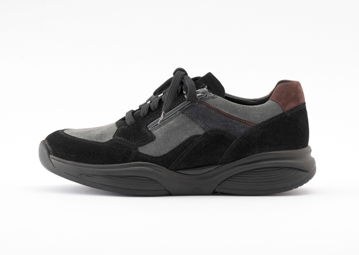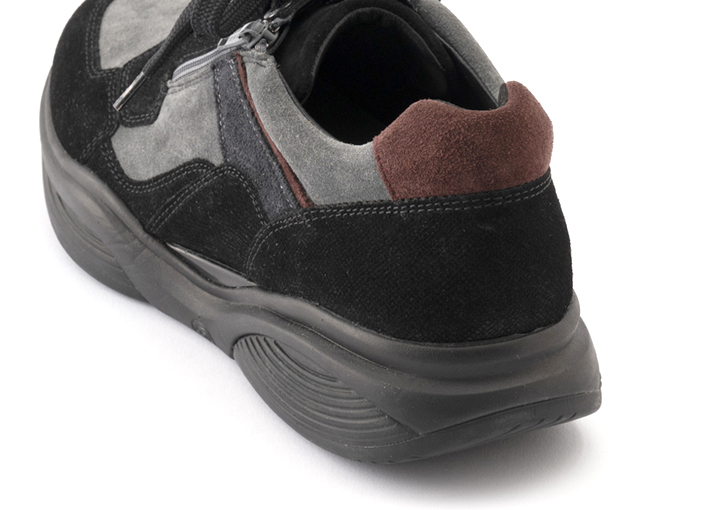 落ち着いたブラックとグレーのコンビネーションに、上品なスエード調の素材感が、カジュアルながらも洗練された大人の足元を演出します。主張しすぎないデザインは、ジャケットやきれいめのパンツとも相性が良く、休日のショッピングや旅行、家族とのお出かけなど、さまざまなシーンで活躍します。