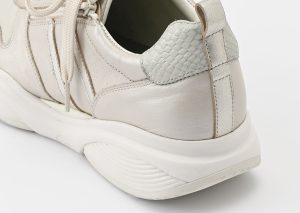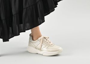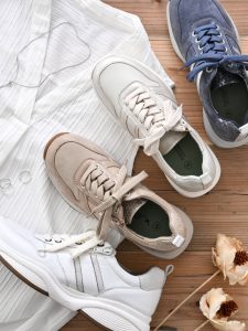 一般的なメッシュ素材のスニーカーだと、どうしても「本気のスポーツ感」が出てしまいがち。ですが、上質なほんのり煌めくスムースレザーを使用しているため、ジャージやレギンスといったラフなスタイルに合わせても、どこか「きちんとした大人」の印象を残してくれます。