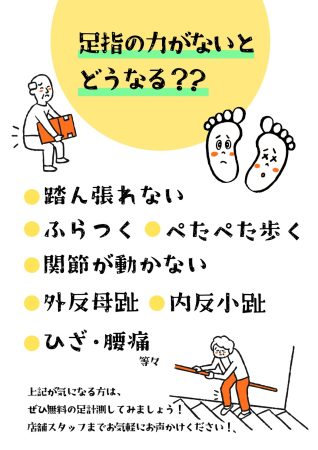 (足指がしっかり機能することでバランスが取れ、転倒のリスクを軽減できます。足指の筋力低下は、高齢者の転倒リスクを高める要因の一つですので、足指の力を弱めない事は健康寿命を延ばすことにもつながります。)