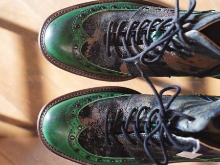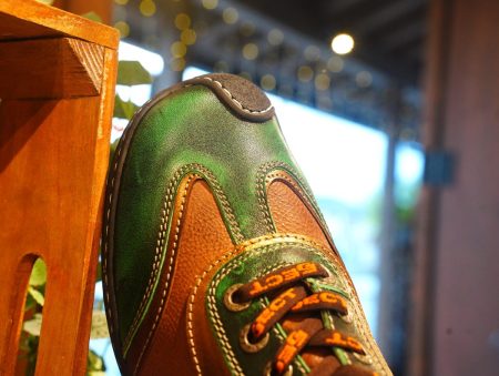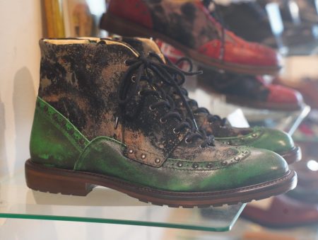 渋いグリーンのレザーとスプラッシュペイント施されたスエードレザーのコンビがとってもオシャレ