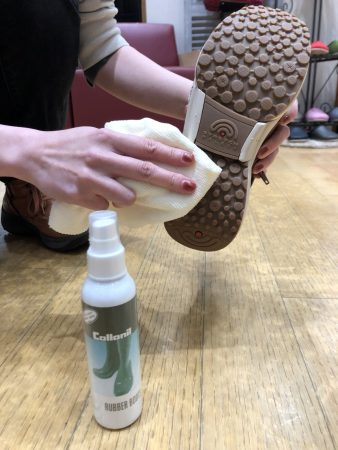 こちらのラバーブーツをお持ちの方は雑巾に吹きかけて靴底を拭くことで
