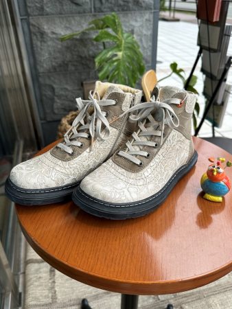 アイボリーとベイリーフ(月佳樹)の色合いがキレイ。アイボリーのレザーには型押しのボタニカル柄が施されており、コーディネートのアクセントになるハイカットブーツです。
